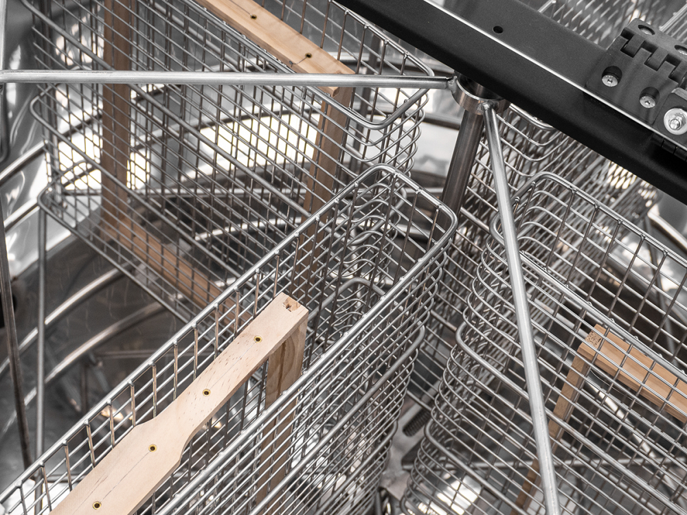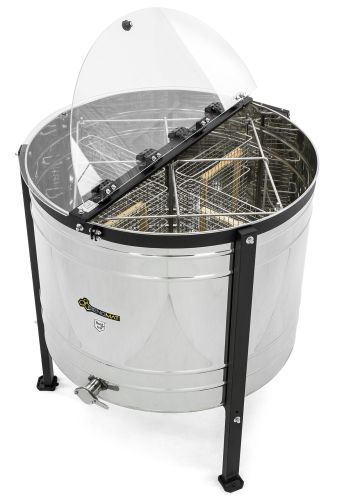 Selbstwende-Schleuderkorb aus Edelstahl mit 4 Taschen für Waben bis 340 mm Höhe, z. B. Normalmaß Anderthalb, Zander Anderthalb, Dadant US Brutram, Dadant Blatt Brutraum oder 8 Flach- bzw. Honigraumrähmchen bis 170 mm Höhe