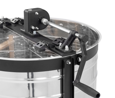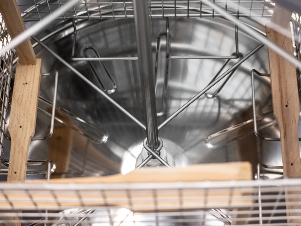 Tangential Rundgitterkorb aus Edelstahl mit Mittelwelle passend für 4 Rähmchen bis 320 mm Höhe, z. B. Normalmaß, Zander, Kuntzsch-Hoch oder Dadant US sowie 8 Rähmchen bis 159 mm Höhe