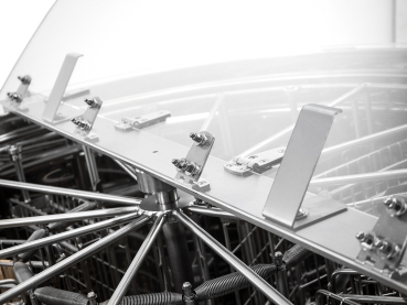 Massive Acrylglas-Schleuderdeckel mit verchromten Scharnieren, Edelstahl-Deckelhaltern und einem Magnet-Sicherheitsverschluss