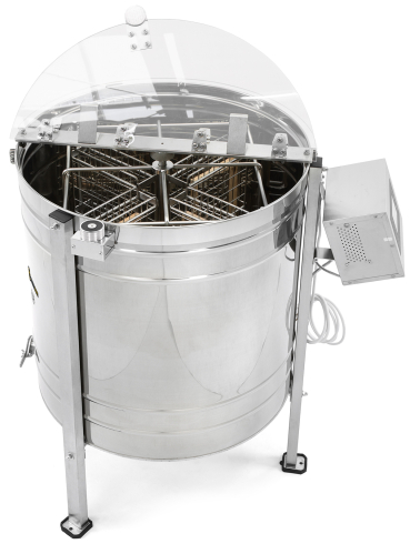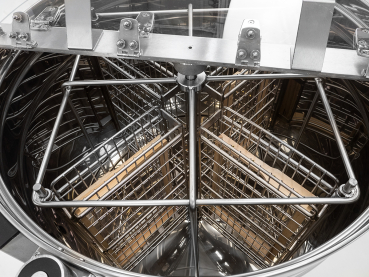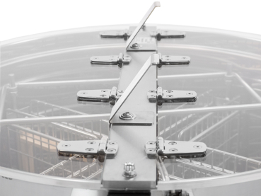 Sehr solider Selbstwende-Schleuderkorb aus Edelstahl mit 4 verstärkten Taschen für Waben bis 245 mm Höhe, z. B. Normalmaß, Zander, Langstroth sowie 8 Rähmchen bis 110 mm Höhe