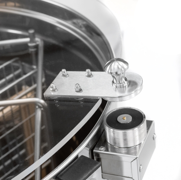 Massive Acrylglas-Schleuderdeckel mit verchromten Scharnieren, Edelstahl-Deckelhaltern und einem Magnet-Sicherheitsverschluss