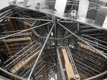 Massive Acrylglas-Schleuderdeckel mit verchromten Scharnieren, Edelstahl-Deckelhaltern und einem Magnet-Sicherheitsverschluss