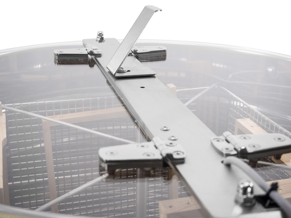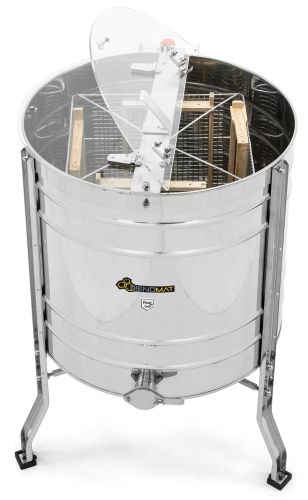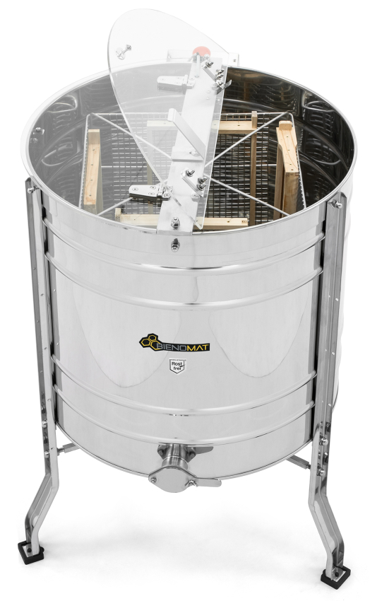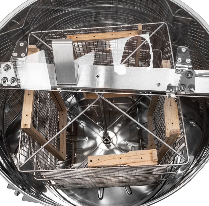 Tangential Rundgitterkorb aus Edelstahl mit Mittelwelle passend für 4 Rähmchen bis 300 mm Höhe, z. B. Normalmaß, Zander, Kuntzsch-Hoch oder Dadant US sowie 8 Halb- oder Honigraumrähmchen bis 110 mm Höhe