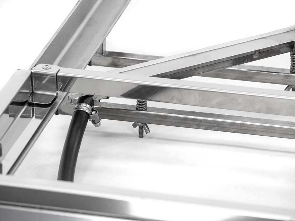 Aufsatz für den Bienomat® Entdecklungstisch Dadant US 100 cm. Gestell mit justierbarem Schiebeschlitten zur Aufnahme von Rähmchen bis 483 x 310 mm mit dampfbeheizten Entdecklungsmessern. Wachs und Honig fallen in den Entdecklungstisch, wo auch die entdeckelten Rähmchen zwischengelagert werden können. Lieferung inklusive Auffangeimer und Dampfmeister (Art. 3830) Außenmaß: ca. 104 x 52 x 13 cm Gewicht: 10,5 kg
