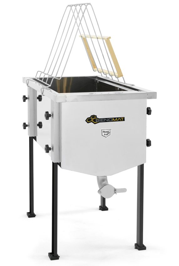 passend für Deutsch Normalmaß Rähmchen mit einem Oberträger von 394 mm bis zu einer Höhe von 290 mm. Hergestellt aus Edelstahl, mit einem Wabenhalter zum Entdeckeln im Stehen und nachfolgendem Einhängen in den 37,5 cm breiten Raum des Tisches. Der nivellierbare Tisch verfügt über einen konischen Schrägboden mit Edelstahl-Quetschhahn von 31 cm Höhe, sowie einen herausnehmbaren Siebbehälter Tischhöhe 80 cm, Größe: 82 x 46,5 x 122 cm Gewicht ca. 18 kg