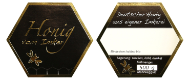 selbstklebend auf Rolle, mit Aufdruck „Honig“, ohne Sortenbezeichnung Maße ca. 70 x 60 mm, jeweils 100 Vorder- und Rückseitenetiketten rückseitig mit Aufdruck 500 g