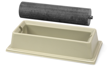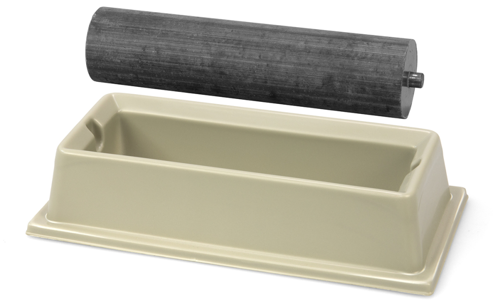 zum Anfeuchten von nassklebenden Etiketten – sauber und schnell. Grauer Wasservorratsbehälter mit anthrazitfarbener, angerauhter Rolle