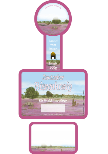 selbstklebend mit Aufdruck „Deutscher Bienenhonig“ ohne Sortenbezeichnung Zusätzlich mit Rückseitenetikett für die Adresse Heide, 100 Stück