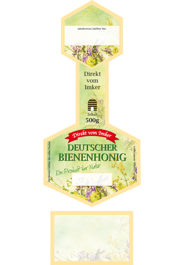 selbstklebend mit Aufdruck „Deutscher Bienenhonig“ ohne Sortenbezeichnung Zusätzlich mit Rückseitenetikett für die Adresse Blumenwiese, 100 Stück