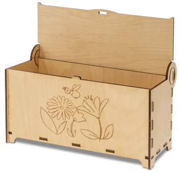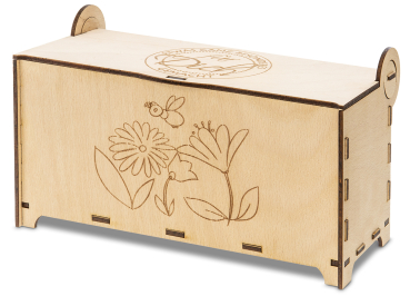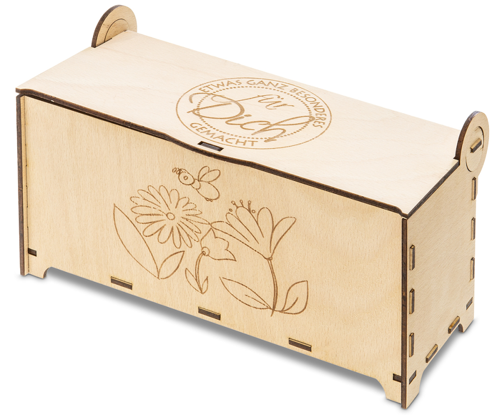 lasergeschnitten, mit Gravur "... für Dich gemacht" und frontseitigem Blumenbild Außenmaß: 27 x 13 cm, Höhe 15,5 cm