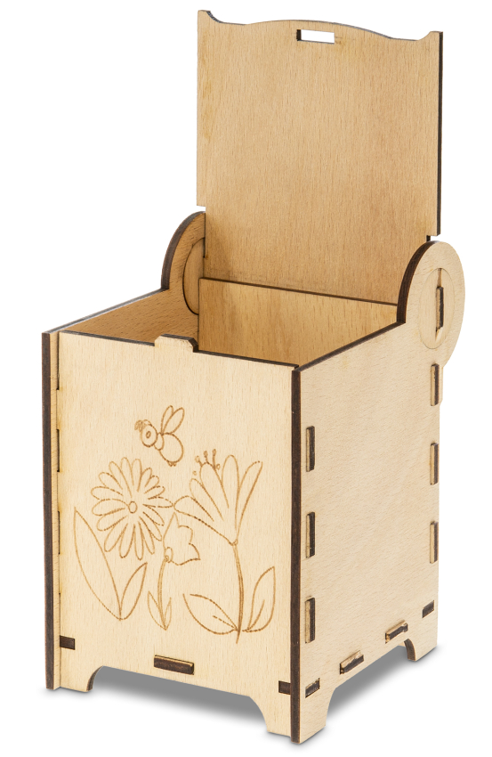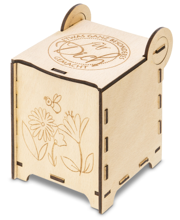 lasergeschnitten, mit Gravur "... für Dich gemacht" und frontseitigem Blumenbild Außenmaß: 10 x 13 cm, Höhe 15,5 cm