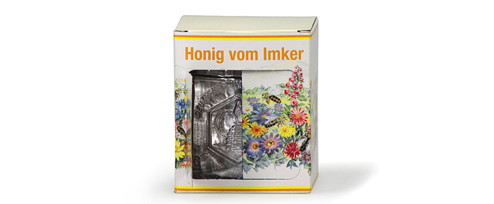 mit Aufdruck "Honig vom Imker" und rückseitigem freien Stempelfeld Außenmaß: 8,5 x 8,5 cm, Höhe: 10 cm