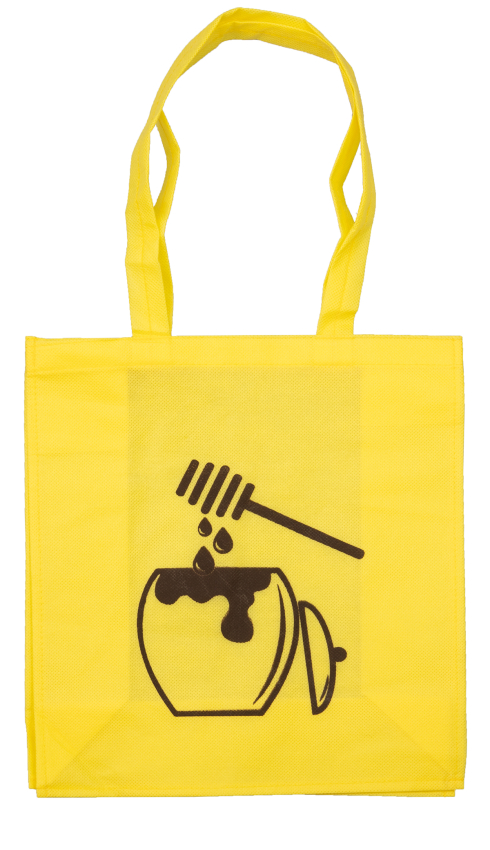 mit braunem Honigtopfmotiv und festen Tragegriffen. Hergestellt aus strapazierfähigem Wigofil Spannvlies Größe ca. 30,5 x 14,5 x 34 cm, Henkel 24 cm Preis pro Stück