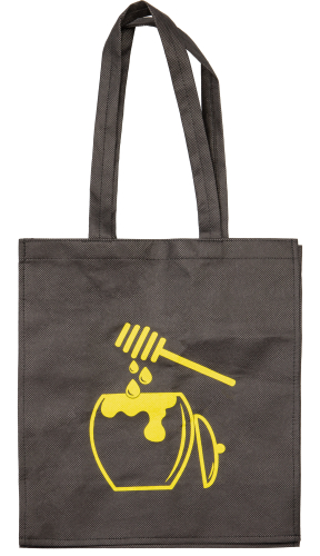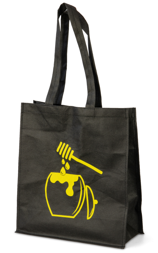 mit gelbem Honigtopfmotiv und festen Tragegriffen. Hergestellt aus strapazierfähigem Wigofil Spannvlies