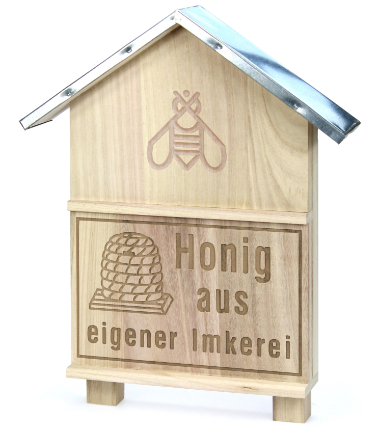 robuster Blickfang aus Holz mit verzinktem Satteldach. Geeignet als Standschild mit Füßen oder zur Wandbefestigung. Höhe ca. 52 cm, Breite 42 cm, Tiefe 9 cm, gefräste Fläche 30 x 20 cm. Gewicht ca. 2 kg
