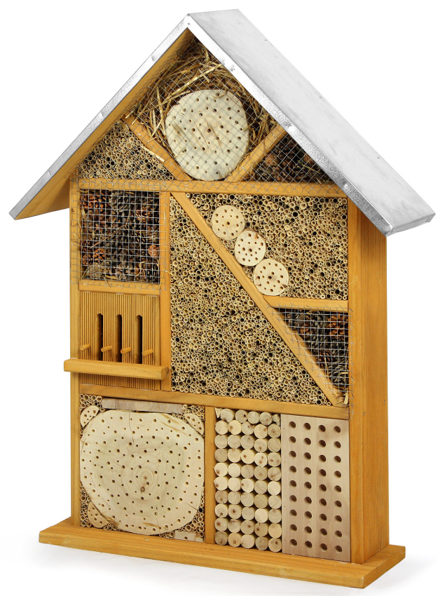 Großes Zuhause für verschiedenste Insekten wie Wildbienen, Florfliegen, Marienkäfer und Schmetterlinge. Hergestellt aus natürlichen Materialien wie Holz, Tannenzapfen, Stroh und Bambus Mit verzinktem Wetterschutzdach Außenmaß: 85 x 21 cm, Höhe: 114 cm Holzstärke 24 mm, Gewicht ca. 21 kg