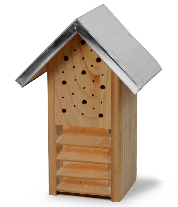 Geeigneter Unterschlupf für Wildbienen, Florfliegen und Marienkäfer. Zweistöckig, obere Hälfte rückseitig aufklappbar um z.B. Zweige für Marienkäfer einzufüllen. Mit verzinktem Wetterschutzdach und Anstrich Außenmaß: 25 x 18 cm, Höhe 36 cm Holzstärke 18 mm, Gewicht ca. 1,5 kg