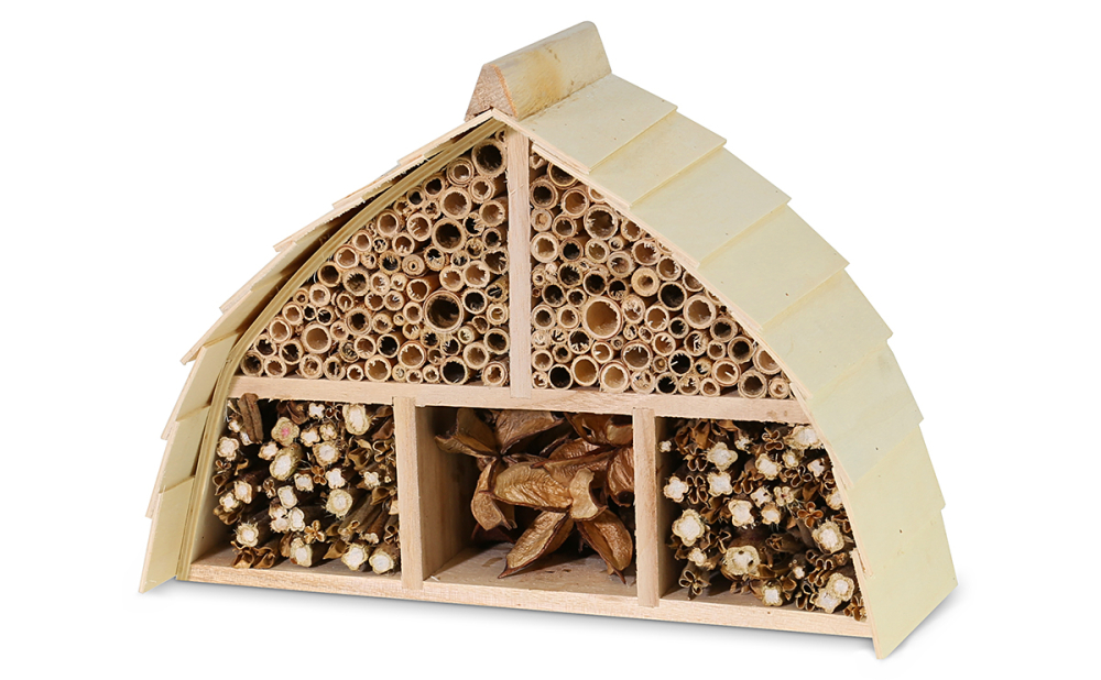 Geeigneter Unterschlupf für Wildbienen, Schlupfwespen, Florfliegen und Marienkäfer. Hergestellt aus natürlichen Materialien wie Holz und Bambus. Größe 28 x 11 cm, Höhe 20 cm Gewicht ca. 0,6 kg