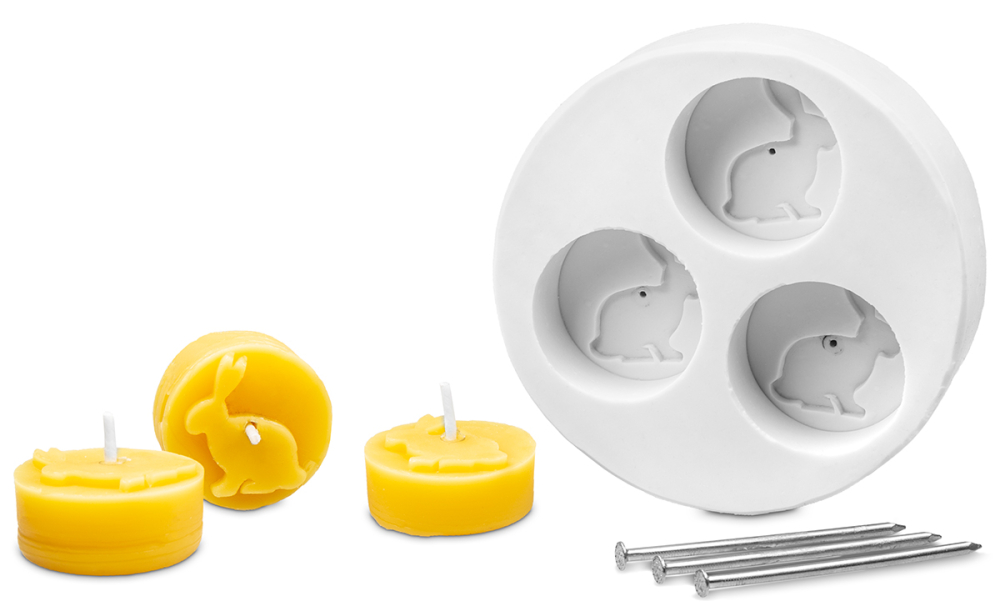 Bei dieser Form werden 3 Nägel mitgeliefert. In der Form ist in der Mitte eine kleine Bohrung, in dieser werden die Nägel fixiert. Nach dem Gießvorgang wird der Nagel entfernt und durch den Kerzendocht ersetzt. Dochte: Fertig gewachste Teelichtdochte, Art. 12150 Größe ca. 1,6 x 3,8 cm Wachsgewicht: ca. 3 x 18 g