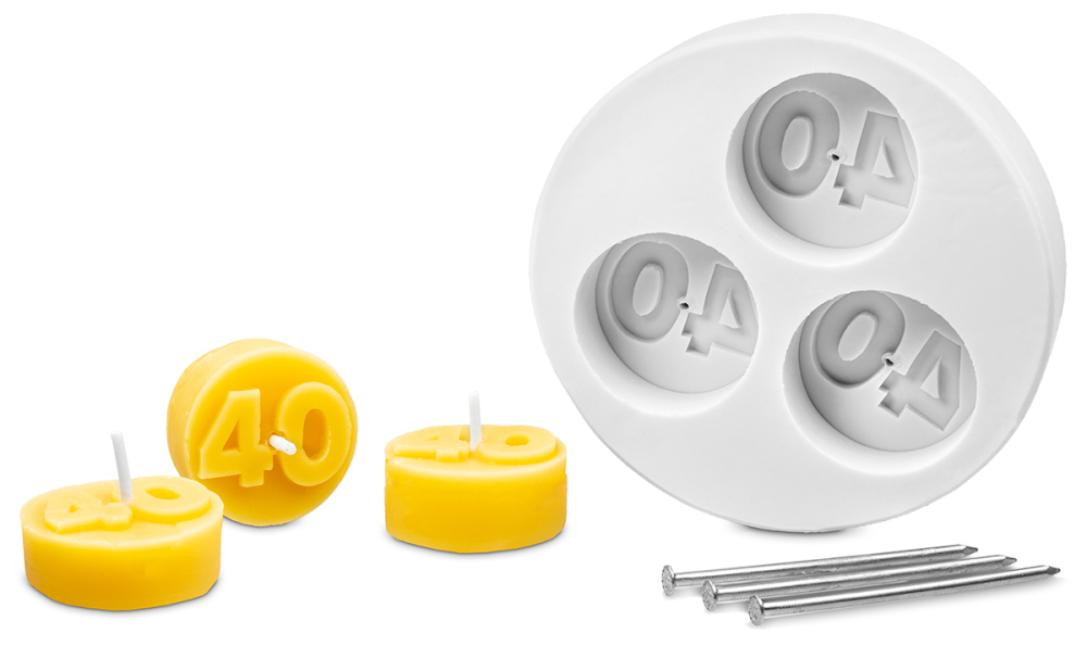 Bei dieser Form werden 3 Nägel mitgeliefert. In der Form ist in der Mitte eine kleine Bohrung, in dieser werden die Nägel fixiert. Nach dem Gießvorgang wird der Nagel entfernt und durch den Kerzendocht ersetzt. Dochte: Fertig gewachste Teelichtdochte, Art. 12150 Größe: ca. 1,6 x 3,7 cm Wachsgewicht: ca. 3 x 18 g