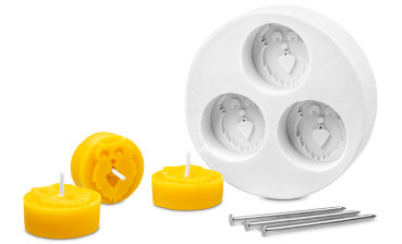 Bei dieser Form werden 3 Nägel mitgeliefert. In der Form ist in der Mitte eine kleine Bohrung, in dieser werden die Nägel fixiert. Nach dem Gießvorgang wird der Nagel entfernt und durch den Kerzendocht ersetzt. Dochte: Fertig gewachste Teelichtdochte, Art. 12150 Größe: ca. 1,6 x 3,7 cm Wachsgewicht: ca. 3 x 18 g