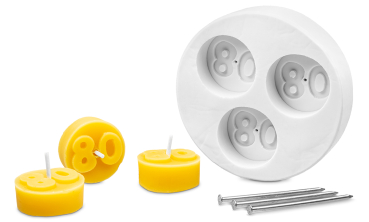 Bei dieser Form werden 3 Nägel mitgeliefert. In der Form ist in der Mitte eine kleine Bohrung, in dieser werden die Nägel fixiert. Nach dem Gießvorgang wird der Nagel entfernt und durch den Kerzendocht ersetzt. Dochte: Fertig gewachste Teelichtdochte, Art. 12150 Größe: ca. 1,7 x 3,6 cm Wachsgewicht: ca. 3 x 18 g