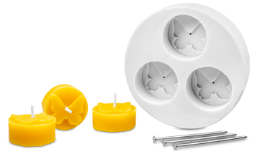 Bei dieser Form werden 3 Nägel mitgeliefert. In der Form ist in der Mitte eine kleine Bohrung, in dieser werden die Nägel fixiert. Nach dem Gießvorgang wird der Nagel entfernt und durch den Kerzendocht ersetzt. Dochte: Fertig gewachste Teelichtdochte, Art. 12150 Größe: ca. 1,6 x 3,8 cm Wachsgewicht: ca. 3 x 18 g