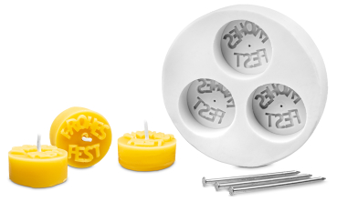 Bei dieser Form werden 3 Nägel mitgeliefert. In der Form ist in der Mitte eine kleine Bohrung, in dieser werden die Nägel fixiert. Nach dem Gießvorgang wird der Nagel entfernt und durch den Kerzendocht ersetzt. Dochte: Fertig gewachste Teelichtdochte, Art. 12150 Größe: ca. 1,7 x 3,8 cm Wachsgewicht: ca. 3 x 18 g