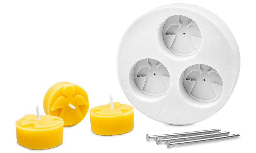 Bei dieser Form werden 3 Nägel mitgeliefert. In der Form ist in der Mitte eine kleine Bohrung, in dieser werden die Nägel fixiert. Nach dem Gießvorgang wird der Nagel entfernt und durch den Kerzendocht ersetzt. Dochte: Fertig gewachste Teelichtdochte, Art. 12150 Größe: ca. 1,7 x 3,6 cm Wachsgewicht: ca. 3 x 18 g