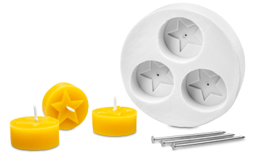Bei dieser Form werden 3 Nägel mitgeliefert. In der Form ist in der Mitte eine kleine Bohrung, in dieser werden die Nägel fixiert. Nach dem Gießvorgang wird der Nagel entfernt und durch den Kerzendocht ersetzt. Dochte: Fertig gewachste Teelichtdochte, Art. 12150 Größe: ca. 1,6 x 3,6 cm Wachsgewicht: ca. 3 x 18 g
