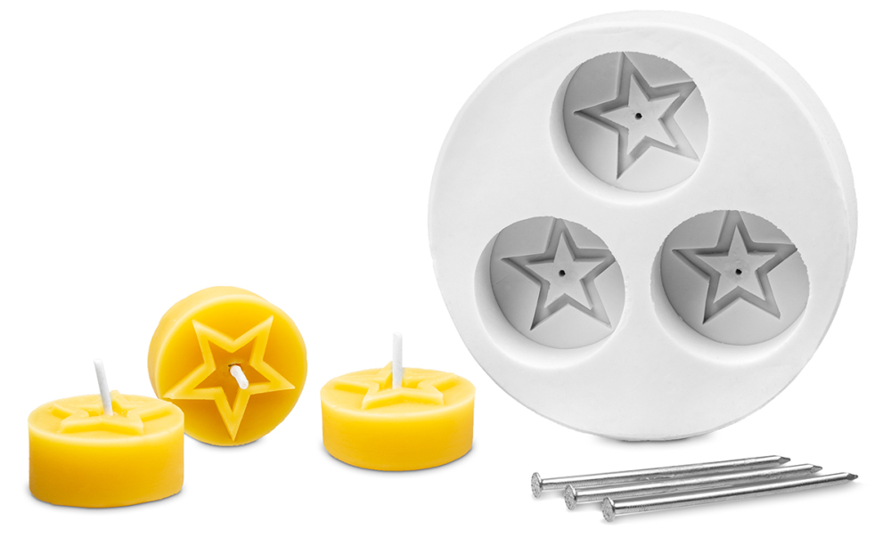 Bei dieser Form werden 3 Nägel mitgeliefert. In der Form ist in der Mitte eine kleine Bohrung, in dieser werden die Nägel fixiert. Nach dem Gießvorgang wird der Nagel entfernt und durch den Kerzendocht ersetzt. Dochte: Fertig gewachste Teelichtdochte, Art. 12150 Größe: ca. 1,7 x 3,6 cm Wachsgewicht: ca. 3 x 18 g
