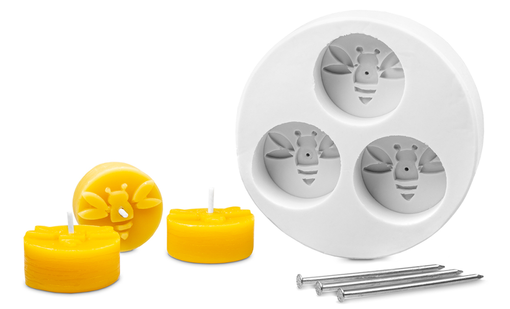 Bei dieser Form werden 3 Nägel mitgeliefert. In der Form ist in der Mitte eine kleine Bohrung, in dieser werden die Nägel fixiert. Nach dem Gießvorgang wird der Nagel entfernt und durch den Kerzendocht ersetzt. Dochte: Fertig gewachste Teelichtdochte, Art. 12150 Größe: ca. 1,7 x 3,8 cm Wachsgewicht: ca. 3 x 18 g