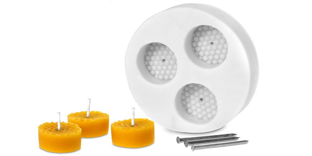 Bei dieser Form werden 3 Nägel mitgeliefert. In der Form ist in der Mitte eine kleine Bohrung, in dieser werden die Nägel fixiert. Nach dem Gießvorgang wird der Nagel entfernt und durch den Kerzendocht ersetzt. Dochte: Fertig gewachste Teelichtdochte, Art. 12150 Größe: ca. 1,7 x 3,7 cm Wachsgewicht: ca. 3 x 20 g