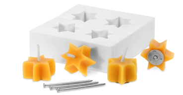 Bei dieser Form werden 5 Nägel mitgeliefert. In der Form ist in der Mitte eine kleine Bohrung, in dieser werden die Nägel fixiert. Nach dem Gießvorgang wird der Nagel entfernt und durch den Kerzendocht ersetzt. Dochte: Fertig gewachste Teelichtdochte Art. 12150 Größe: ca. 3 x 2 cm Wachsgewicht: ca. 4 x 10 g