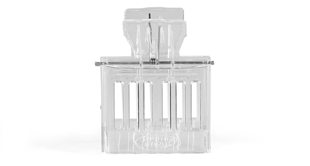 aus Hartplastik mit Edelstahlfeder und 4,2 mm breiten Öffnungen, so können die Arbeiterinnen passieren und die Königin bleibt im Clip