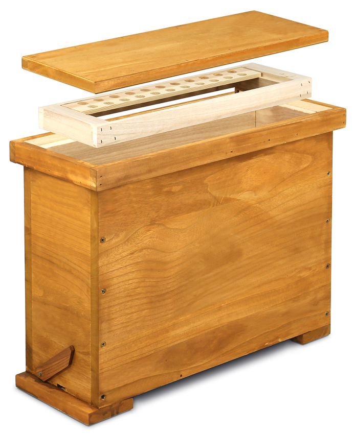 Für 4 Rähmchen Dadant US Brut, mit Lüftungsgitter unten und rückseitig, Abstands- und Auflagering, 5 Zuchtlatten und Deckel, Lieferung ohne Rähmchen Außenmaß 55 x 22 cm, Höhe 43 cm Gewicht ca. 5 kg