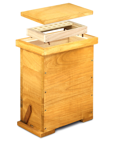 Für 4 Rähmchen Kuntzsch hoch, mit Lüftungsgitter unten und rückseitig, Abstands- und Auflagering, 5 Zuchtlatten und Deckel, Lieferung ohne Rähmchen Außenmaß 36 x 22 cm, Höhe 47 cm Gewicht ca. 4 kg