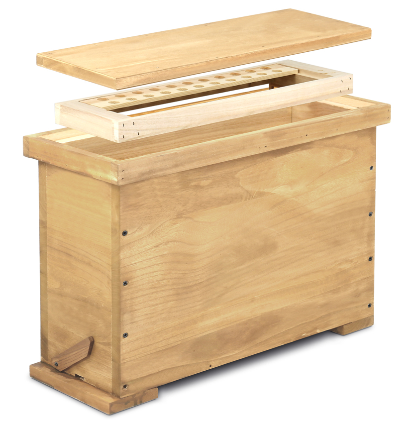 Für 4 Rähmchen Normalmaß, mit Lüftungsgitter unten und rückseitig, Abstands- und Auflagering, 5 Zuchtlatten und Deckel, Lieferung ohne Rähmchen Außenmaß 47 x 22 cm, Höhe 35 cm Gewicht ca. 4 kg