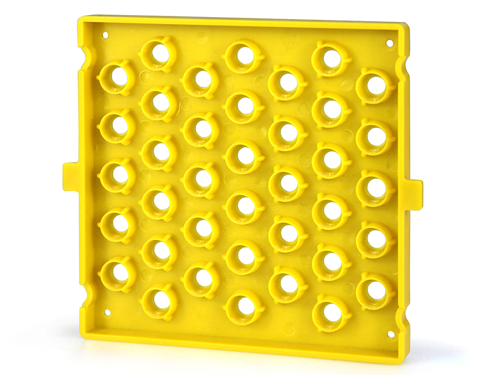 für diverse Königin-Zuchtsysteme, aus gelbem Kunststoff, zur rückseitigen Aufnahme von bis zu 38 Einsteckzellen oder als Grundplatte zur Gelée Royale Ernte. Größe 11 x 11 cm