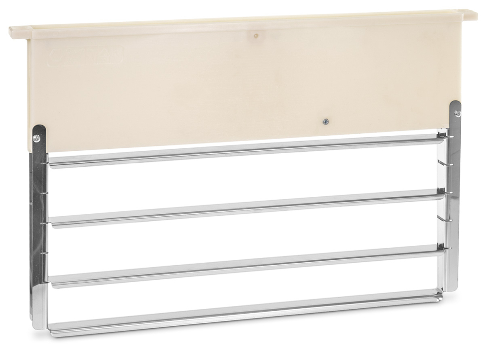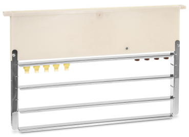 Edelstahlrahmen mit montierter 1 Liter Kunststoff Futtertasche als Hybridrahmen im Dadant Blatt Maß von 470 x 300 mm. Die Lieferung erfolgt mit 3 Edelstahlschienen zur Aufnahme von Systemsockeln oder Weiselnapfhaltern z.B. des Nicot oder Jenter Zuchtsystems (Lieferung ohne Näpfe)