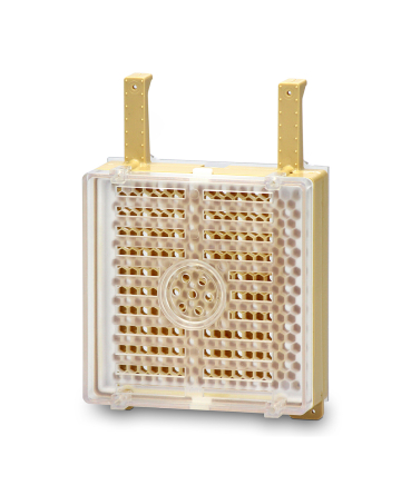 5-teilig, bestehend aus beigefarbenem Zuchtwabenrahmen, weißem Wabengitter, transparentem Absperrgitter, rundem Deckel und einer rückseitigen Abdeckplatte Außenmaß ca. 12 x 12 cm plus zwei Rähmchenaufhängungen von ca. 4,5 cm. Tiefe 3,5 cm