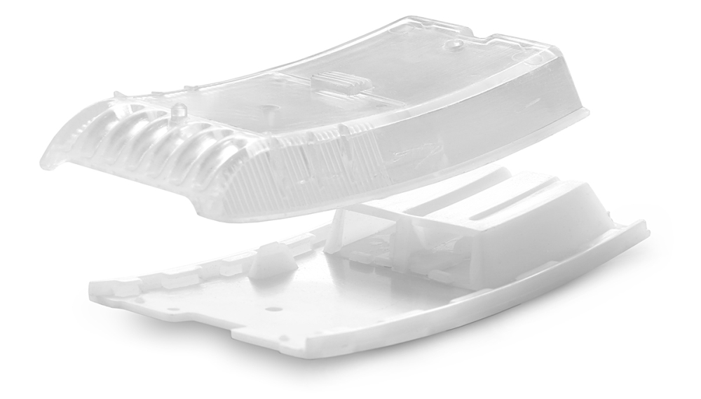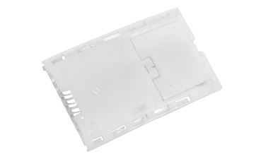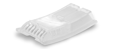 aus Kunststoff, gebogene Form, verschiebbare Frontplatte, zwei Futterkammern mit separater Klappe zum Befüllen. Größe 75 x 45 mm, Höhe ca. 15 mm