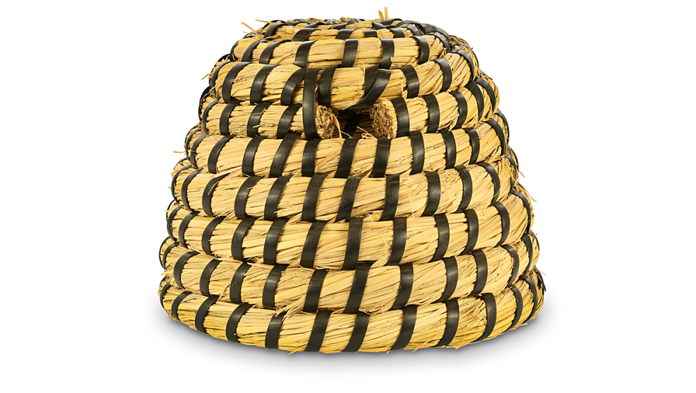 aus Stroh und mit dunklem Band handgeflochten nach klassischem Vorbild. Größe ca. 25 x 18 cm, Wandstärke 2 cm, Gewicht ca. 0,6 kg