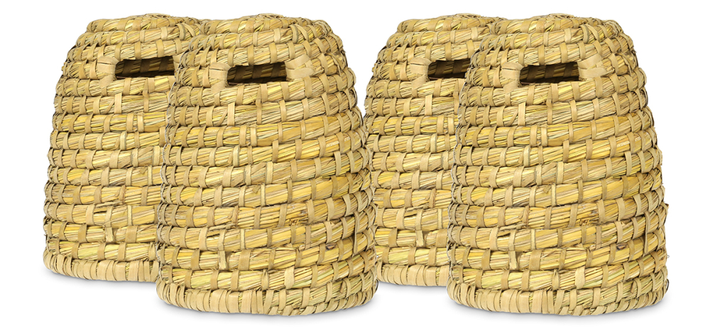 Set bestehend aus 4 handgeflochtenen Stroh-Dekokörben mit einem Durchmesser von ca. 15 cm und einer Höhe von ca. 17 cm. Wandstärke 1,5 cm, Gewicht pro Korb ca. 0,2 kg