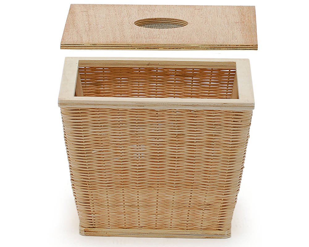 bestehend aus einem geflochtenem Kunstschwarmkorb von ca. 33 x 33 x 24 cm im Set mit einer satt aufliegenden Holzabdeckung mit Falz und rundem Edelstahl Lüftungsgitter