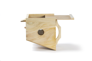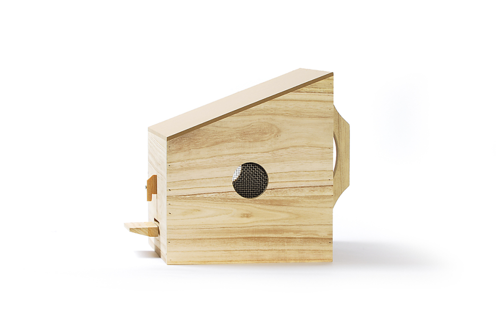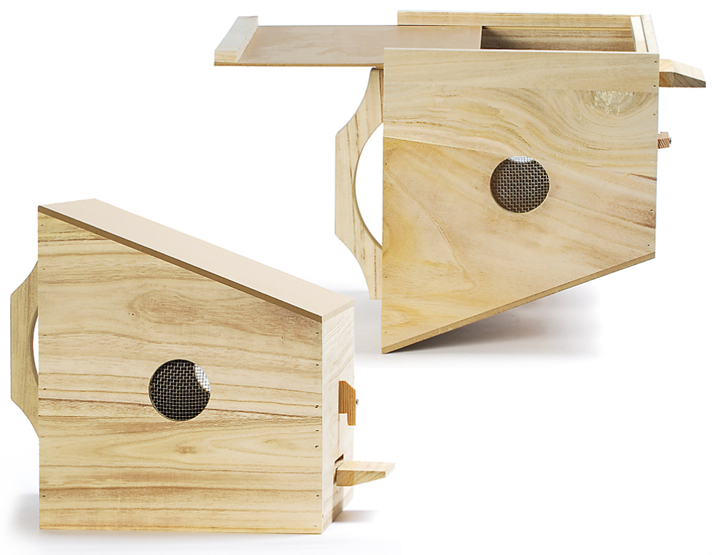 handlicher Schwarmfangkasten mit stabilem Handgriff zur Einhandnutzung. Lieferung mit Bodenschieber und verschließbarem Flugloch. Größe ca. 28 x 31 x 32 cm