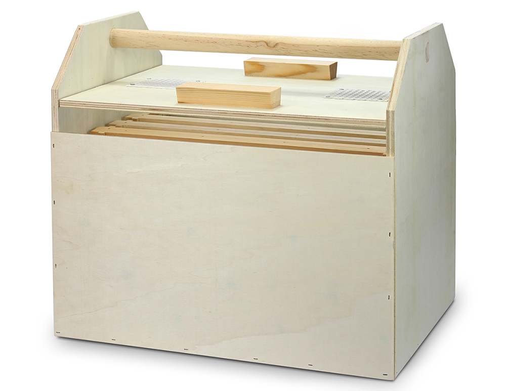 aus Holz, mit Auflagedeckel, zwei Lüftungsgittern, zwei Handgriffen und Tragegriff. Passend für 8 Rähmchen Normalmaß. Größe ca. 42 x 30 cm, Höhe ca. 38 cm, Gewicht ca. 3 kg