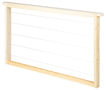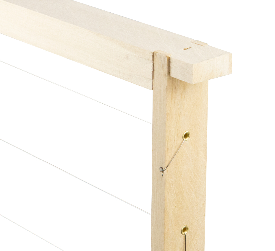 waagerecht gedrahtet, 10-fach geöst Holzstärke: Oberträger 27 x 22 mm Ohren 25 x 10 mm Holzstärke: Unterträger 18 mm, oben gerundet Länge: Oberträger 482 mm / Unterträger 448 mm Höhe: 285 mm Preis pro Rähmchen
