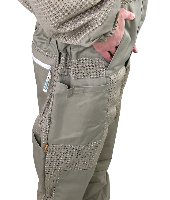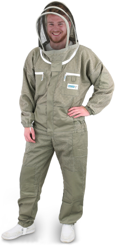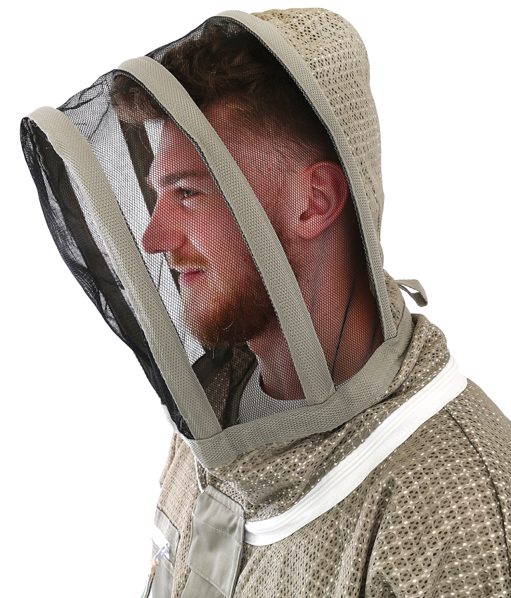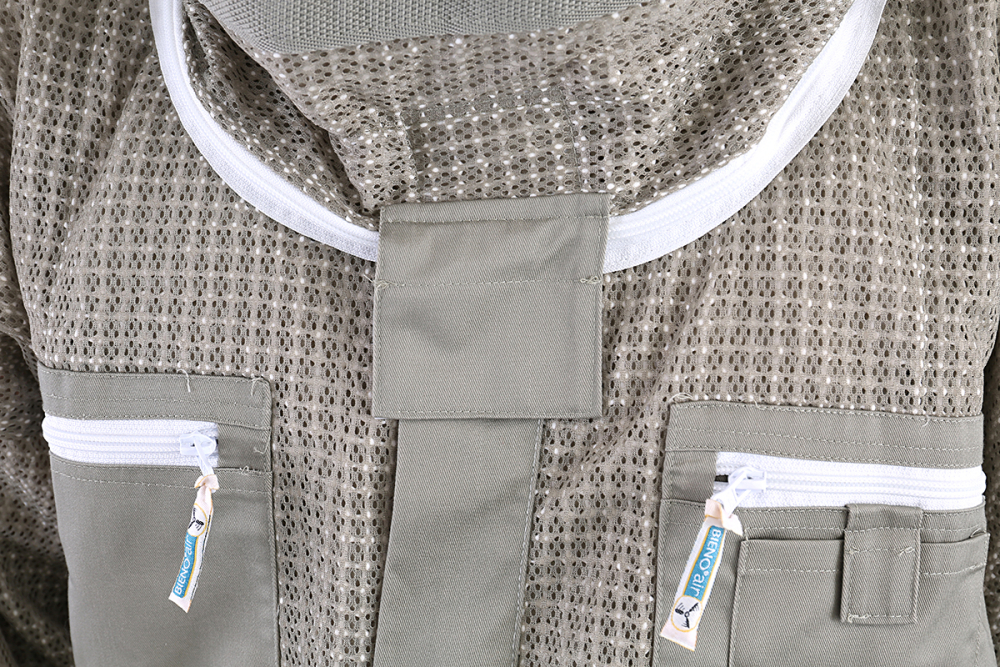 Die ventilierende Schutzbekleidung in innovativer BienoAir® Machart - luftig und atmend. Hergestellt in drei Lagen, khaki und voll waschbar. Angenehmer, leichter Tragekomfort gepaart mit praktischen Details wie verdecktem Reißverschluss, acht Taschen, Gummibündchen an Ärmeln und Beinen sowie sich selbst aufstellender, englischer Imkerhaube Design registriert beim DPMA und gesetzlich geschützt