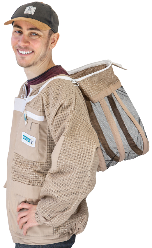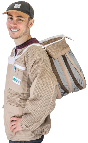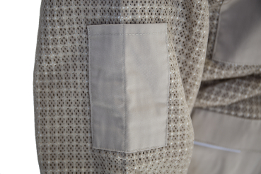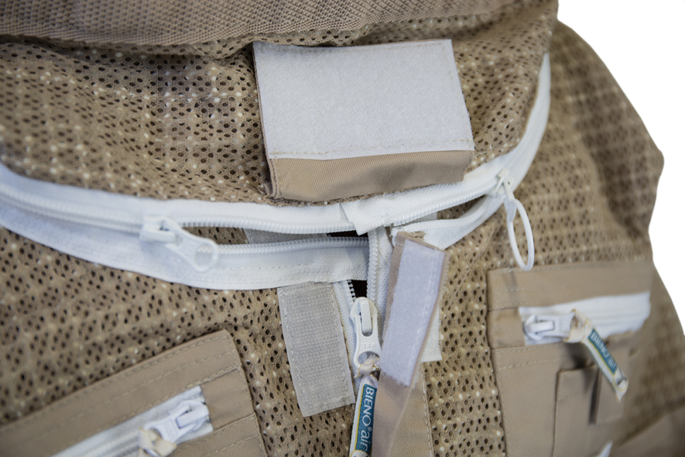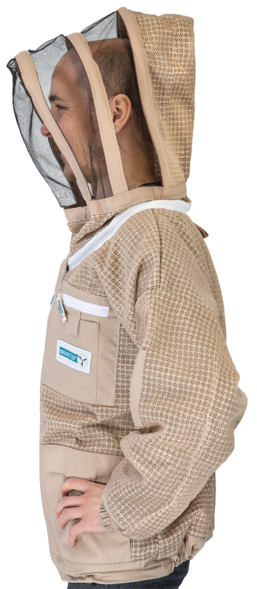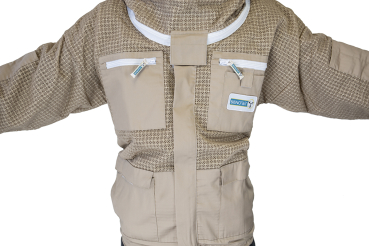 Die ventilierende Schutzbekleidung in innovativer BienoAir® Machart - luftig und atmend. Hergestellt in drei Lagen, mokka und voll waschbar. Angenehmer, leichter Tragekomfort gepaart mit praktischen Details wie verdecktem Reißverschluss, fünf verschließbaren Taschen, einstellbaren Gummibündchen an den Ärmeln sowie sich selbst aufstellender, englischer Imkerhaube Design registriert beim DPMA und gesetzlich geschützt